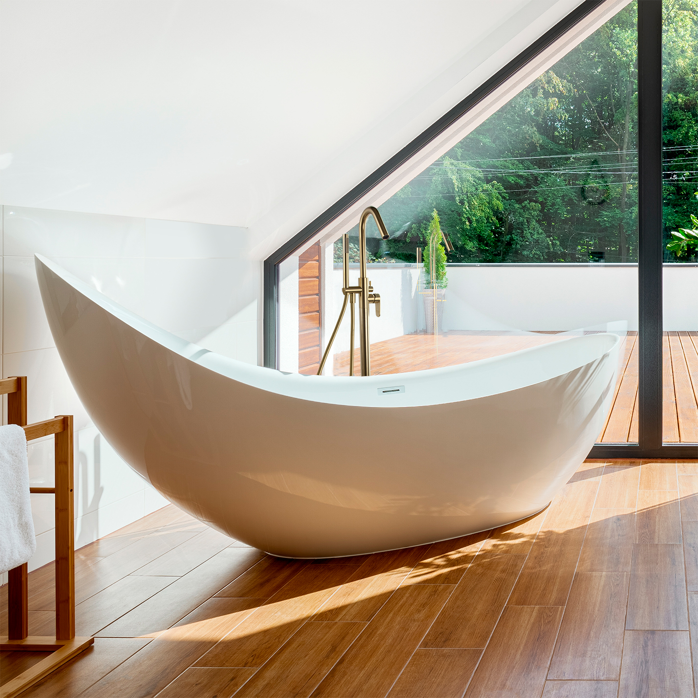 Robinet de pied pour baignoire au design gracieux, équipé d’un équipement de douche, d’un flexo anti-calcaire et d’un système de fixation au sol résistant. Sa finition en or brossé offre une haute résistance grâce à son traitement PVD. Ce robinet de pied allie fonctionnalité et esthétique pour une expérience de bain complète et élégante.